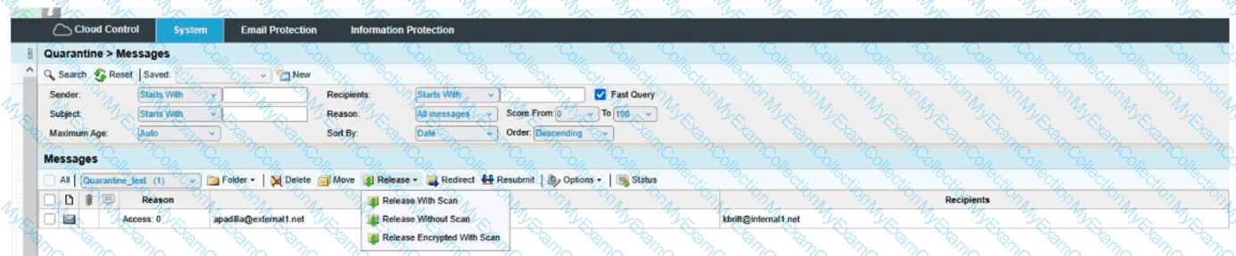 This is a Quarantine administration question focused on understanding the difference between release options. The exhibit clearly shows that Release Encrypted With Scan combines rescanning plus encrypted delivery , making Answer D the verified course-aligned choice.