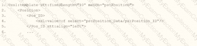 This applies xtt:fixedLength="10" to the xsl:template element and xtt:align="left" to Pos_ID. Similar to option B, XTT attributes must be applied to the specific element (Pos_ID) being formatted, not the template itself, making this incorrect.
