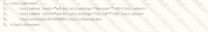 In Workday integrations, XSLT is used to transform XML data, such as the output from an Enterprise Interface Builder (EIB) or a web service-enabled report, into a desired format for third-party systems. In this scenario, you need to write XSLT to process wd:Dependents_Group elements and output a relationship code based on the value of the wd:Relationship attribute or element. The requirement is to output "SP" for a "Spouse" relationship, "CH" for a "Child" relationship, and "OTHER" for any other relationship, using an