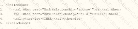Context in Template: Since the template matches on wd:Dependents_Group, the test conditions operate on the current wd:Dependents_Group element and its attributes, ensuring the correct relationship code is output for each dependent. The XML snippet shows wd:Relationship as an element, but Workday documentation and integration practices often standardize it as an attribute in XSLT transformations, making @wd:Relationship appropriate.